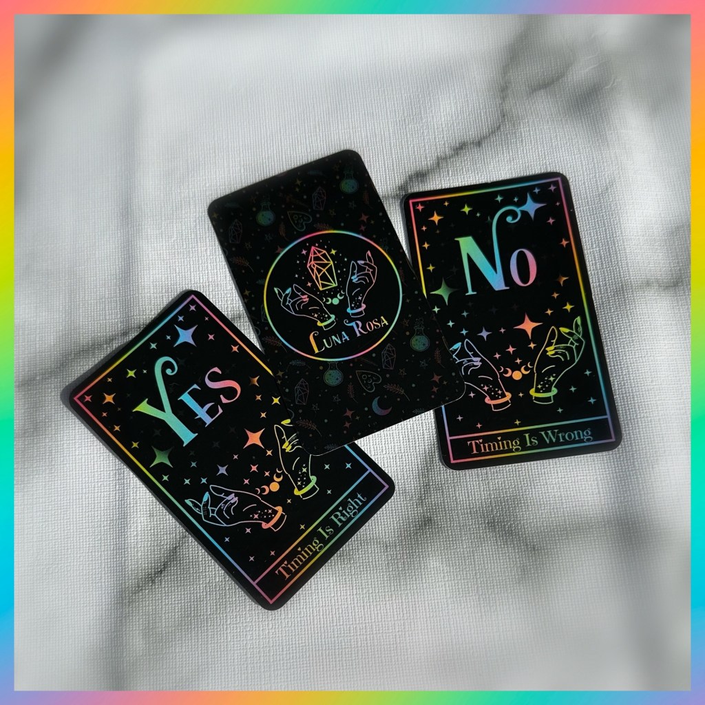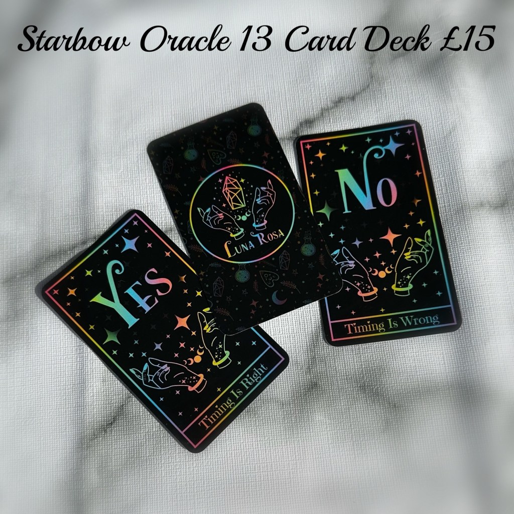 This oracle deck has pastel ombré details over striking dark background. With direct “Yes” & “No” answers this deck of 13 which includes a prayer for protection is great for answering direct questions to give you insight on a situation! They also work well as a clarifier with classic tarot.